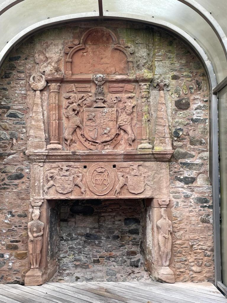 Visitors are free to wander around, noticing several points of interest. Above the entrance path is an oriel window and the stair that goes to nowhere now. The entrance door in the courtyard is framed by an impressive visual display of the coat of arms of the 1st Marquis and Marchioness of Huntly, those of King James VI & Queen Anna then two religious panels which were defaced in the reformation – this piece is unique in Britain.